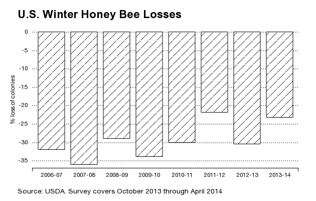 蜜蜂在冬季的损失是正常的,但没有达到这种程度。美国农业部发言人Kim Kaplan表示,在蜂群崩溃综合症(即蜜蜂消失现象的名称)出现之前,损失率约为每年15%到20%,而在发现瓦螨(1987年首次在美国发现的亚洲蜜蜂寄生虫)之前,损失率为10%到12%。今年接受调查的7200名养蜂人中,几乎三分之二报告的损失超过了18.9%的经济可持续水平。