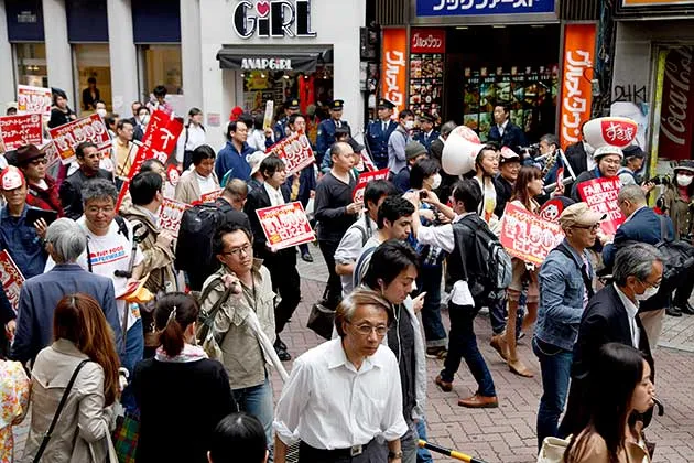 快餐工人在东京涩谷地区抗议以争取更好的薪酬和工作条件,时间是5月15日摄影:罗德里戈·雷耶斯·马林/日本新闻通过科比斯