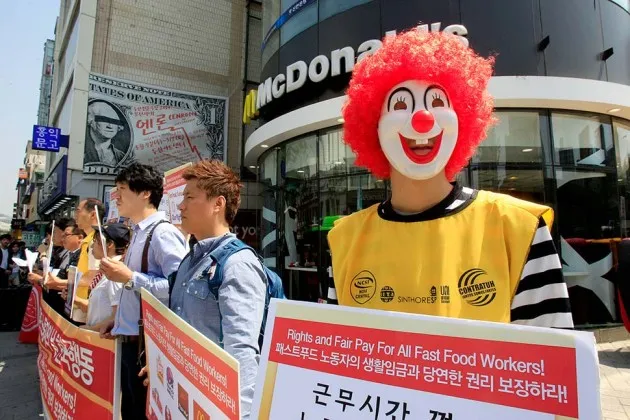 一名穿着麦当劳叔叔服装的抗议者于5月15日在首尔的麦当劳外参加了一场要求提高快餐工人工资的集会摄影:安永俊/AP照片大约一年半前在纽约市 开始的快餐工人提高工资运动现在已经扩展到亚洲、欧洲以及中南美洲的城市。甚至新西兰和非洲的一些地方也加入了这一远程努力,以提高工资。根据抗议组织者的说法,周四在超过30个国家计划举行活动。