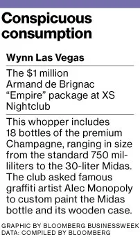 俱乐部老板在很大程度上依赖愿意通过承诺花费数千美元购买酒水来预订桌子的顾客。根据Wynn的XS和Tryst俱乐部的管理合伙人Jesse Waits的说法,这种所谓的瓶装服务占据了拉斯维加斯夜总会收入的约70%。在Cosmopolitan的Marquee,2012年与XS并列为全国收入最高的酒吧,收入超过8000万美元,价格从350美元起售一瓶Absolut伏特加。Nazarian在Bellagio的Hyde团队推出了“250,000美元套餐”,其中包括一瓶30升的Armand de Brignac “Ace of Spades”香槟,以及开启赌场著名音乐喷泉的特权。该俱乐部迄今已售出两份。“你不是为了喝香槟而这样做,”Waits说。“我们吸引女孩。男孩们追她们并花钱。”