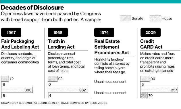 强制信息披露是左右两派都接受的罕见政策。自由派认为披露赋予了小人物权力,而保守派则认为这提高了市场效率。为了对抗肥胖,国会要求在食品包装上披露卡路里含量。为了改善医疗服务,医疗保险披露医院和医生集团的评级。为了使购房过程更加透明,抵押贷款条款也需要披露。消费者金融保护局局长理查德·科德雷在去年一次听证会上表示了共识,他说:“披露是政府机构改善市场运作的最佳工具之一。”