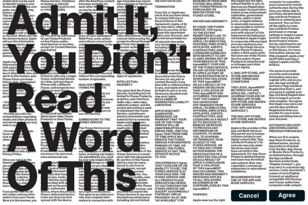 在提出披露可能造成伤害的强有力论点之前,作者们先提出了一个简单的论点,即披露往往是无用的。考虑一下 苹果 的 iTunes Store 的条款和条件——在苹果允许你购买一首99美分的歌曲之前,你必须同意的那段小字律师语言的弹出窗口。Ben-Shahar 将整个内容打印了出来。它有32页。除了其他内容外,它保护了苹果的版权,保护其免受诉讼,并禁止13岁以下的儿童使用,除非通过学校。(谁知道呢?)“理解所有条款对新手来说需要的不是几个小时,而是几天,”作者们写道。
