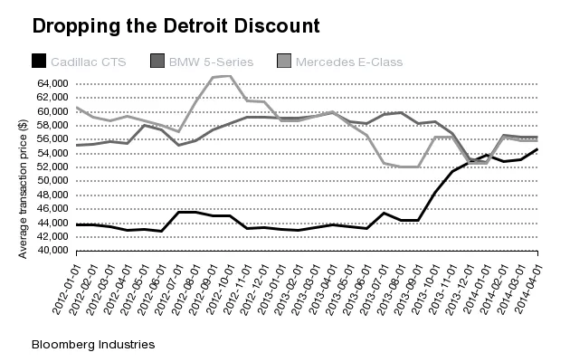 上个月在美国,凯迪拉克 CTS的平均售价为54,571美元,几乎与备受推崇的 梅赛德斯-奔驰 E级(55,788美元)或 宝马 5系(56,284美元)相当。一年前,这款中型凯迪拉克的售价不到44,000美元,比其德国竞争对手低了超过16,000美元。简而言之,凯迪拉克的买家不再要求底特律的折扣——他们愿意支付欧元溢价。