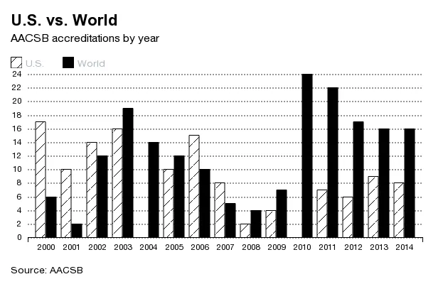 从上面的图表可以看出,在过去的二十年里,获得AACSB认证的学校数量急剧增加。很多增长来自美国以外的学校: