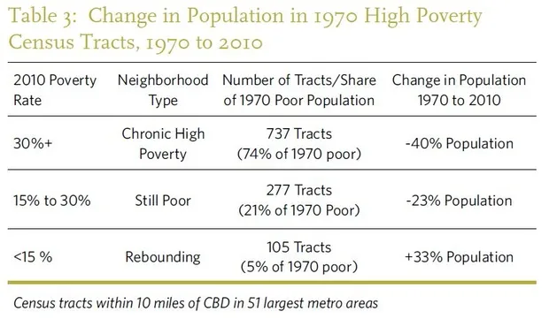 根深蒂固的贫困几乎是这些社区中最常见的现象。到2010年,这些贫困社区中有三分之二,即750个地区,仍然受到慢性和集中贫困的困扰。总体而言,在这四十年中,他们的人口减少了40%,因为许多能够搬走的人都搬走了。
