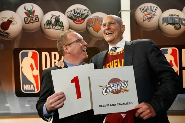 克利夫兰骑士队总经理大卫·格里芬(左)和小股东杰夫·科恩在骑士队于5月20日在纽约赢得NBA选秀抽签的头号选秀权后庆祝摄影:凯西·威伦斯/AP照片克利夫兰的体育迷在一年中大约364天几乎没有什么可欢呼的。当然,唯一的例外是NBA选秀抽签的晚上,这是联盟通过抽签的方式激励失利球队的球迷,抽取顶级大学球员的选秀权,并通过超大信封在ESPN上揭晓结果。