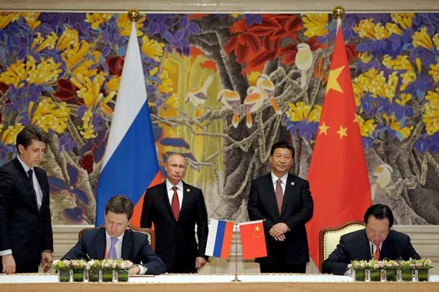 习(站立,右中)和普京(左中)在上海与俄罗斯天然气工业公司米勒(坐着,左)和中国石油天然气集团公司董事长周吉平(坐着,右)签署仪式上照片由亚历克谢·德鲁津宁/法新社通过Getty Images提供经过15年的谈判,中国和俄罗斯似乎终于达成了一项协议,共同进入天然气业务,并建设一条连接两国的管道。根据这项为期30年的协议,中国将确保获得其经济所需的天然气(并帮助改善空气质量),而俄罗斯则可以减少与欧洲的紧张关系。俄罗斯可能永远不必担心受到中国的制裁。