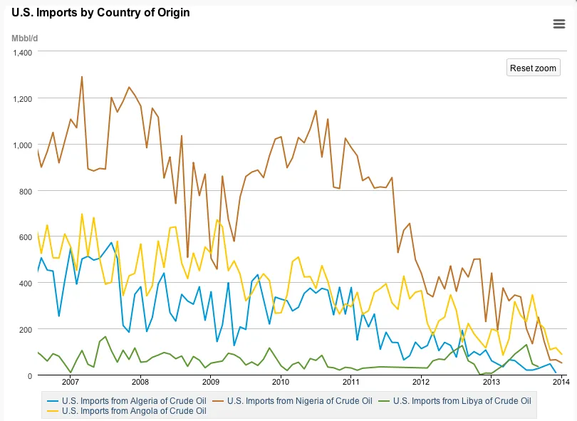 这基本上是四个主要非洲石油生产国的故事,它们几乎不再向美国销售:尼日利亚、安哥拉、阿尔及利亚和利比亚。尼日利亚对美国的出口降幅最大,从2011年的每天超过一百万桶降至截至2月的约38,000桶。