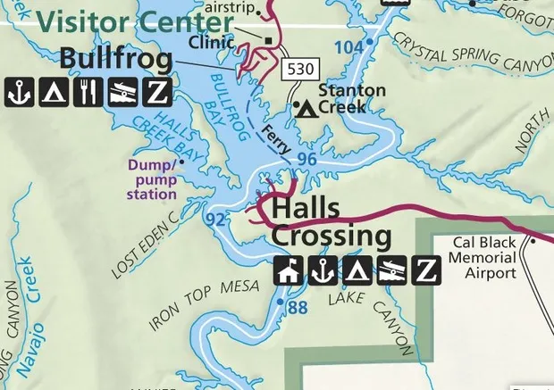 这是靠近亚利桑那州格伦峡谷大坝的水库,如国家公园管理局提供给游客的地图所示。看起来水位曾经高到可以从霍尔斯溪到布尔弗罗格湾而不进入主河道: