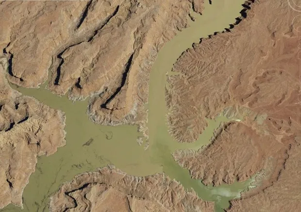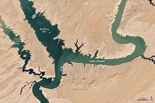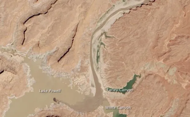 鲍威尔为一系列西部州提供水和电,但在经历了十多年的干旱后,它正 dangerously 接近变成一个无用的水洼。这些由Landsat 8卫星拍摄的图像清楚地显示了水库的减少状态。上面,犹他州湖泊的北部区域略微被泥泞的科罗拉多河滋润。漂白的岩石呈象牙色,显示出水库满时水位的地方。