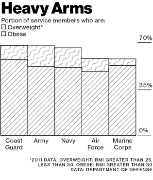 根据一份 国防部的调查(PDF),在2011年,51.2%的军人根据身体质量指数(BMI)被认为超重。这并不一定是衡量武装部队体能的完美指标。它是身高和体重的函数,这意味着非常肌肉发达的人可能会被记录为超重或肥胖。(在6英尺6英寸、218磅的情况下,迈克尔·乔丹在他打球时略显超重。)调查承认对肌肉个体的相当大误算;同时,军队中并没有那么多人像乔丹那样的体型。