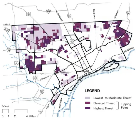 底特律废弃物清除工作组该小组收集了现场数据,并将其与更广泛的地方统计数据结合起来,例如止赎活动和当地儿童人数,以识别需要立即干预的区域。“临界点”区域包括需要关注的22,700个建筑物。
