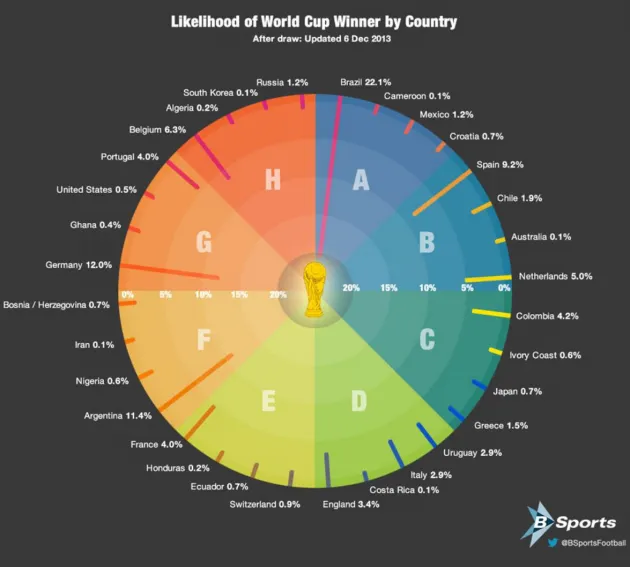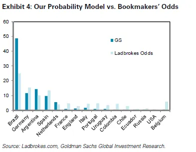 高盛 高盛动用了其最强大的计量经济学工具来预测比赛的结果,广泛使用了蒙特卡洛模拟和Elo排名。其公式给主场球队巴西提供了48.5%的夺冠机会,其次是阿根廷14.1%,德国11.4%,西班牙9.8%。Ladbrokes.com在该文件发布时仅给巴西约25%的世界杯获胜机会,因此高盛对巴西的预估显然偏高。
