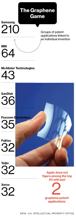 三星看起来是这场竞争的早期领先者。根据2013年英国知识产权局的报告,该公司在全球范围内拥有数百项关于该材料的已发布专利申请。在美国,三星拥有38项专利,并在其向美国专利商标局提交的申请中至少提到17项使用“石墨烯”一词。虽然并非所有这些请求都可能获得批准,但其数量证明了该公司寻找该材料商业用途的决心。苹果在美国提交了至少两项提到石墨烯的专利申请。英国报告列出了 IBM、 施乐、富士康工业以及 富士通等其他提交申请的公司。