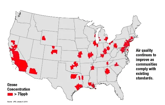 根据当前的规则,臭氧水平应减少到每十亿75个部分。大部分国家通过了测试。下面地图上的红点显示了那些未通过的地区:
