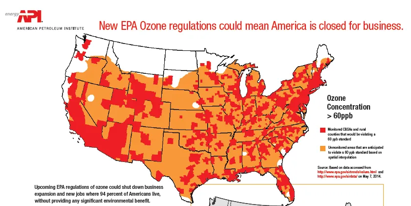 美国石油协会表示,如果环保署收紧臭氧限制,美国大部分地区的商业活动将停滞。红色代表糟糕。美国石油协会