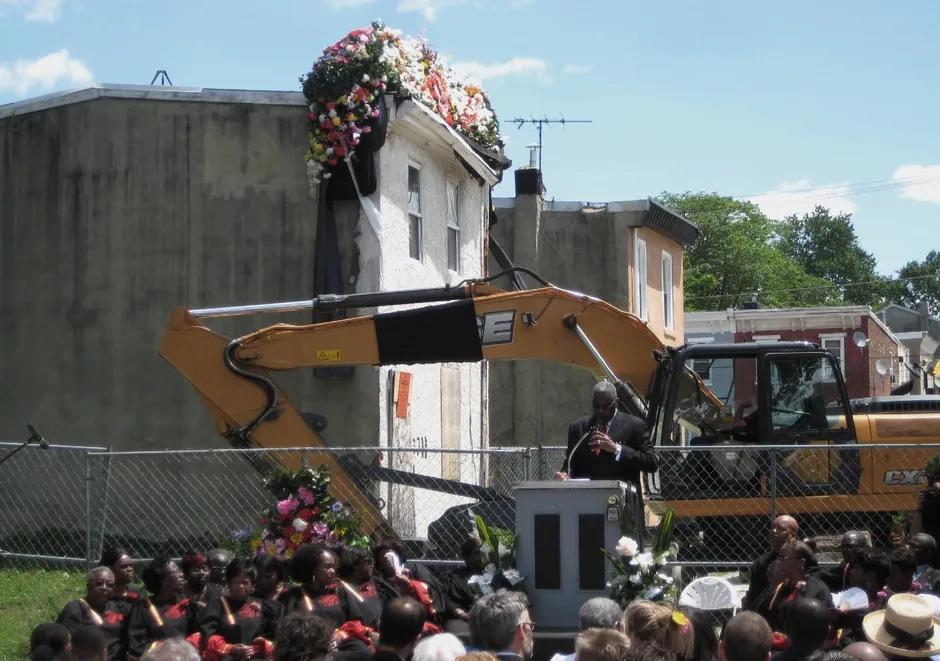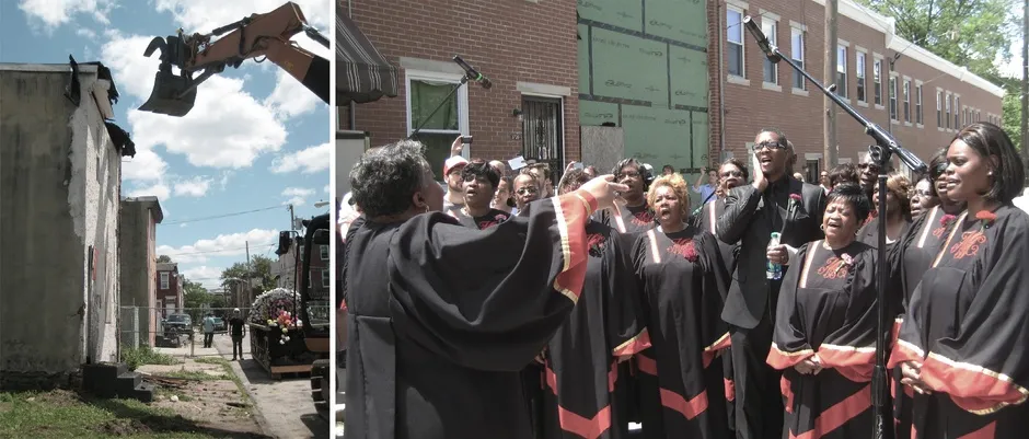 他们通常的讲坛位于37街和华莱士街的拐角处。但在这个周末,他们在一位不寻常邻居的葬礼上唱歌:一座位于3711梅隆的小型破旧排屋,那个晚上被拆除。