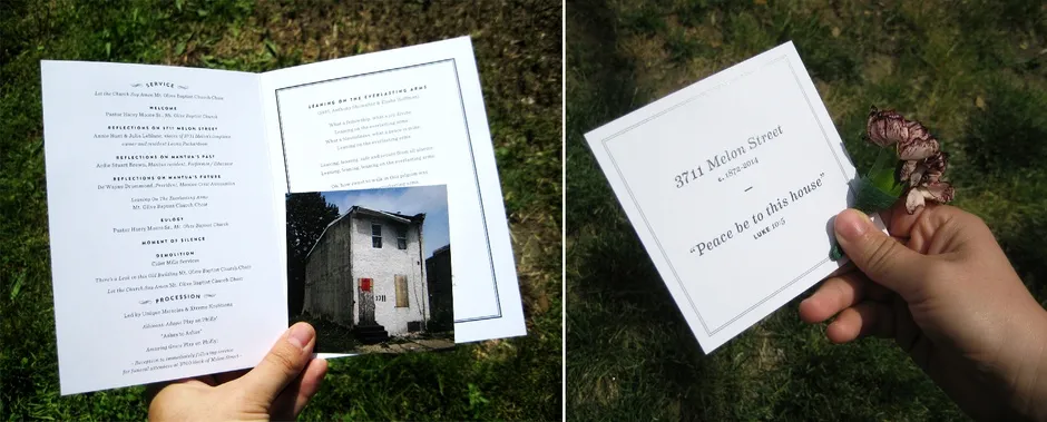 周六在费城Mantua社区举行的“家园葬礼”的官方程序。马克·伯恩斯大多数住宅拆迁显然没有那么隆重。这确实是许多西费城Mantua社区邻居在今年早些时候首次听到这个想法时的感受。但正如橄榄山的牧师哈里·摩尔提醒那些来庆祝和哀悼3711 Melon生活的人,“这些房子就像个体——有一天在,有一天出。”