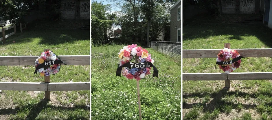 游行的场景。马克·伯恩斯在途中,游行经过更多的这些“缺牙”空地。当地艺术家史蒂夫和比利·杜法拉设计了这个项目,他们挂上了花环,小型的花冠,标记着这些曾经承载着心爱家园的空地。