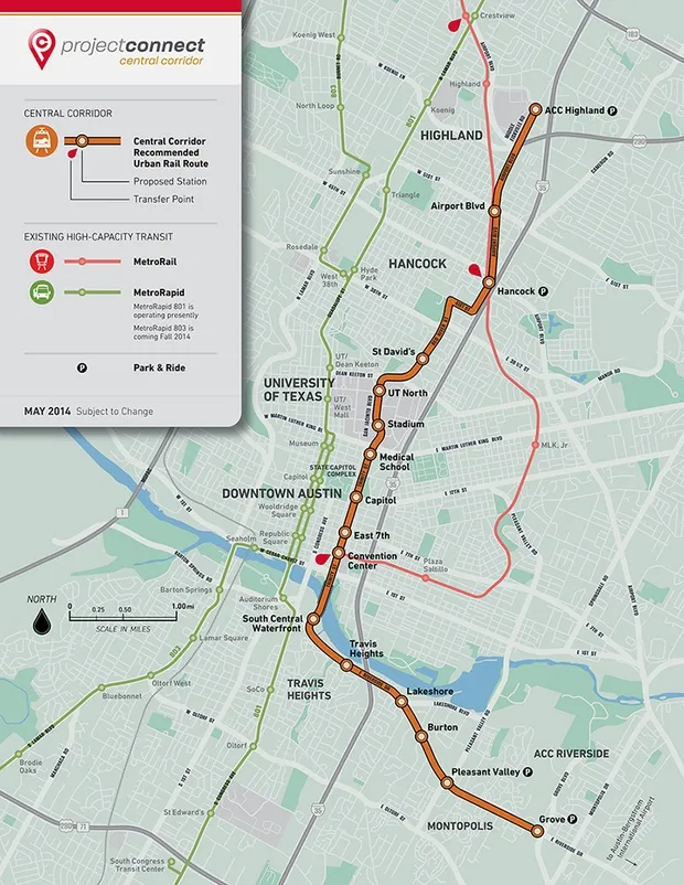 在德克萨斯州中部,更多的人正在质疑在奥斯丁东南部沿着Highland–East Riverside子走廊修建轻轨的智慧,而不是在Guadalupe–North Lamar 子走廊修建在奥斯丁西南部。奥斯丁交通部门的公共信息专家切yenne Krause表示,许多来自奥斯丁西南部的行程,特别是来自西校园社区的行程,主要是东西方向,而不是南北方向。Keahey表示,在市中心以东,奥斯丁可以修建轻轨,以服务未来几年增长最快的地方。