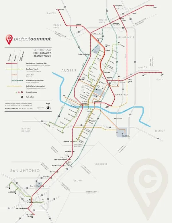 德克萨斯州奥斯丁提议的轻轨交通线路的渲染图。项目连接这可能是福特新皮卡的预告: *城市驾驶更灵活。乡村通勤更快速。*但奥斯丁的新混合项目旨在让司机离开他们的车辆。