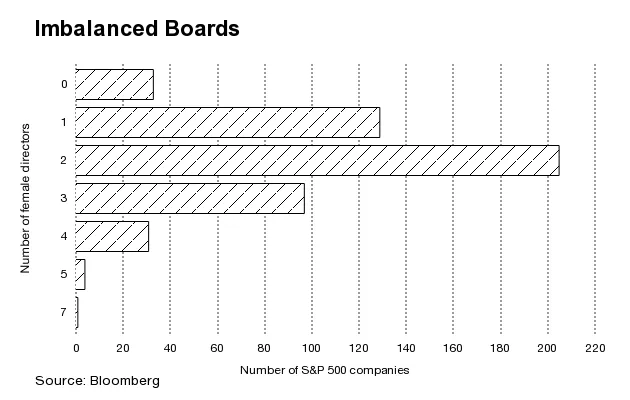 根据对彭博数据的分析,在标准普尔500指数中,只有36家公司在董事会中有超过三名女性。只有五家公司有超过四名女性董事:雅芳产品、宝洁、KeyCorp、坎贝尔汤和雅诗兰黛。