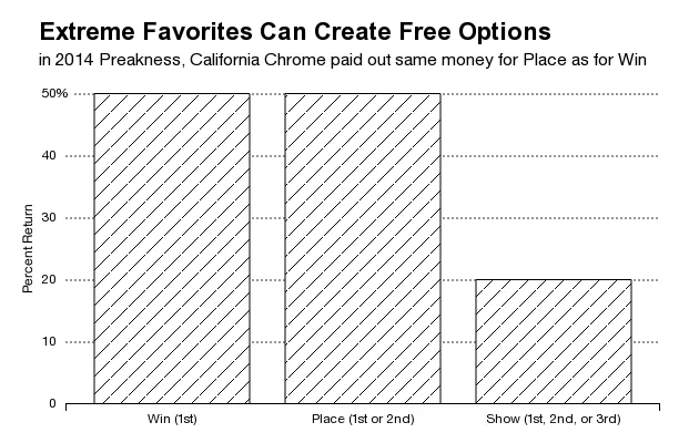 这种情况可能只会在你有一个极端热门的比赛中出现,且有很多非理性投注者,比如在三冠赛最后一场的California Chrome。这使得今年的贝尔蒙特锦标赛独特:这是一个难得的机会,可以更聪明地投注,如果你真的、绝对需要投注于Chrome,这值得在周六考虑。