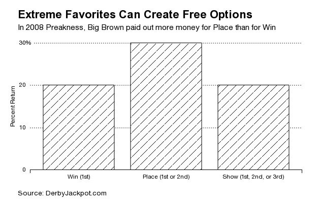 以下是一些数据来支持这一观点:在最近的20场三冠赛中,只有一位其他赢家的赔率与Chrome相似。Big Brown在2008年Preakness赛中赢得的赔率为2.40美元,而在同一场比赛中获得第二名的赔率为2.60美元。这甚至更加偏斜——你在投注Big Brown获得第二名而不是赢得比赛时会赚得更多。更多的钱投注于Big Brown获得第二名而不是赢得比赛。更高的回报和更短的赔率——这足够吸引人去行动。
