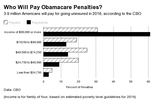 几乎三分之一的CBO估计在2016年将支付罚款的390万人生活在中高收入家庭中,年收入至少为99,000美元,适用于四口之家。由于他们的收入较高,这些人将支付总罚款金额的61%。