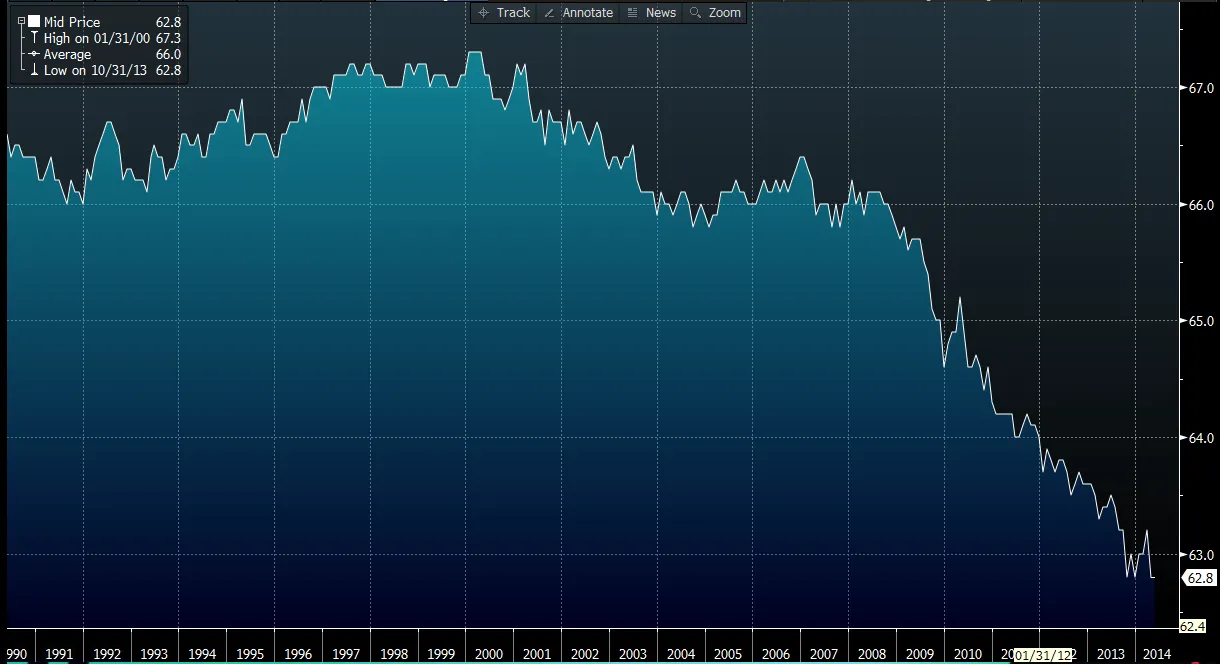 劳动参与率在2000年达到67%以上的峰值彭博社