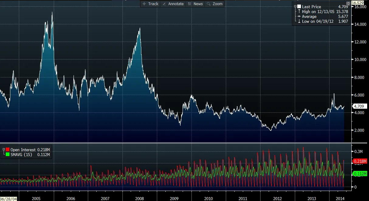 在这种情况下,作者确定了每百万BTU的溢价为2.23美元。换句话说,IHS认为如果没有水力压裂,天然气的价格将比过去几年高出约50%。以下是过去五年天然气价格变化的图表: