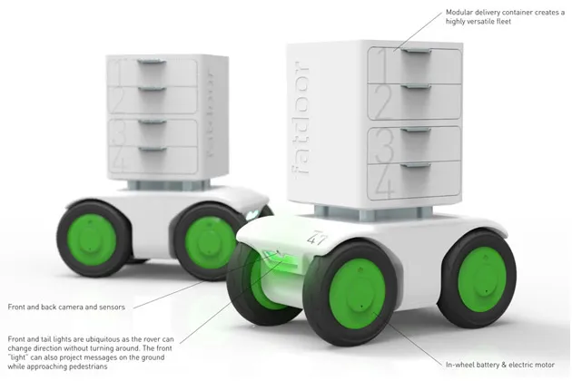 该公司还制造了 Fatdoor Rover。这个东西大约四英尺高,顶部看起来像一个文件柜,底部是四个轮子。它基本上是一个自主车辆,旨在去餐馆取食物,然后将食物送到附近的房子。人们将通过他们的 Fatdoor 应用程序订购食物,公司计划开发软件,以协调机器人到达的时间,以及餐馆和客户打开送货抽屉的方式。“当 Rover 到达餐馆前面时,它会发送一条消息来加载它,”Abhyanker 说。“然后你会得到一个解锁代码,放入食物,然后让它继续前行。” 我看到过这个机器人的测试版本;它看起来也很酷,并且似乎能正常工作。