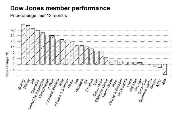 如果平均指数委员会确实选择一只“便宜”的苹果加入道琼斯,谁会退出?明显的候选人是 IBM 和 高盛。冒着对大蓝公司施加压力的风险——请参见我们最近关于 IBM在云计算中挣扎的封面故事——该公司在过去12个月中表现最差,下降了9.2%。高盛的价格变化排名第四,下降了0.9%。与此同时,IBM和高盛在道琼斯中的权重分别位居第二和第三,这意味着它们的低迷表现对指数产生了过大的拖累。