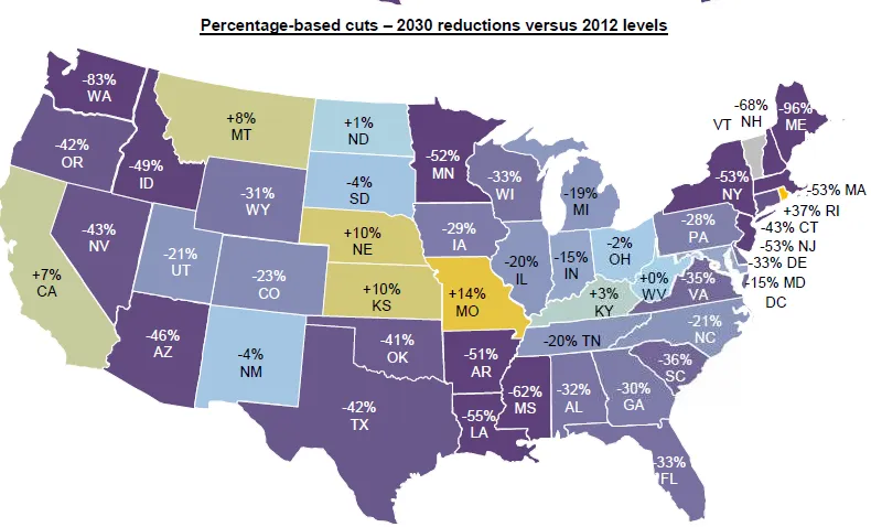 例如,缅因州、马里兰州、马萨诸塞州和纽约州自2005年以来的排放量均减少了超过46%。环保署计算出他们可以继续保持这种趋势,并为每个州设定了激进的减排目标。另一方面,肯塔基州和西弗吉尼亚州自2005年以来的排放量减少得要少得多,分别为7%和19%。因此,他们的减排目标要低得多。从某种角度看,环保署正在鼓励那些已经在污染控制方面取得进展的州变得更加清洁。从另一个角度看,政府则在惩罚那些减排最多的州,同时让那些没有减排的州轻松过关。