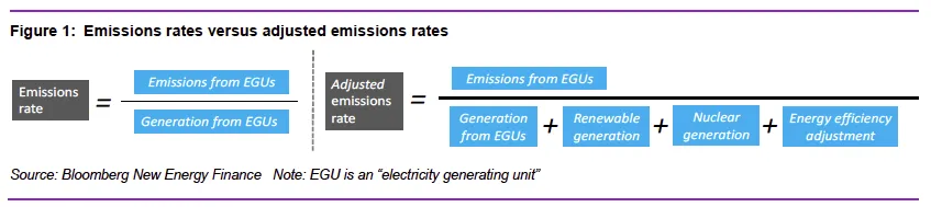BNEF 的分析依赖于一个关键点:州标准并不要求绝对减少 CO。相反,它们要求各州降低其产生的排放量与其发电量之间的比率。EPA 给予各州很大的灵活性来决定如何降低这个比率。规则并没有明确说明一个州必须减少其排放量以降低比率。如果,比如说,一个州增加了其发电量,那么它的排放量也可以上升,而不会破坏这个比率。