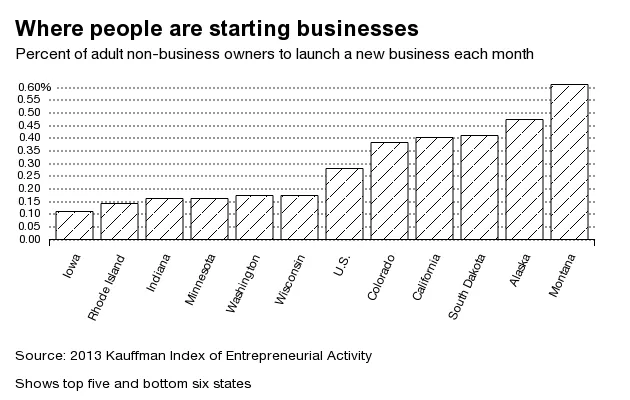 友好度调查不擅长预测人们在哪里创业。尽管在商业友好度上得了不及格分,加利福尼亚州在去年却拥有全国最活跃的创业率之一,根据早期的考夫曼研究。