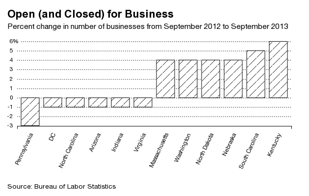 同样,弗吉尼亚州在小企业友好度调查中的高分并没有阻止在截至2013年9月的一年内关闭的企业数量超过新开设的企业数量,这是美国劳工统计局最新的数据。