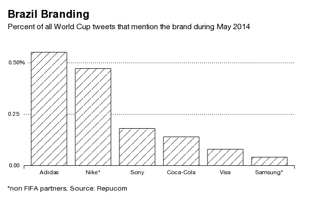 一份周四发布的报告在首场比赛前的几个小时,提供了两大服装巨头之间竞争的一些早期结果,以及关于足球营销的各种迷人信息。在关于世界杯的全球讨论中,推特上的体育营销研究人员Repucom发现耐克在品牌中紧随阿迪达斯之后,位居第二。