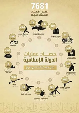 这份400页的ISIL报告中的数字涉及伊拉克的活动,尽管它们早于该组织当前的运动,而该运动使伊拉克岌岌可危,濒临全面内战。但该报告显然是致力于建立一个华盛顿智库“战争研究所”在最近的分析中所描述的“以指标为驱动的军事指挥”的领导者的工作。该阿拉伯文档的第二页包含一个精巧的“行动摘要”图形,突出了7,681次确认的军事行动,并配有侠盗猎车手风格的图标,表示汽车炸弹、摩托车炸弹和火箭攻击。