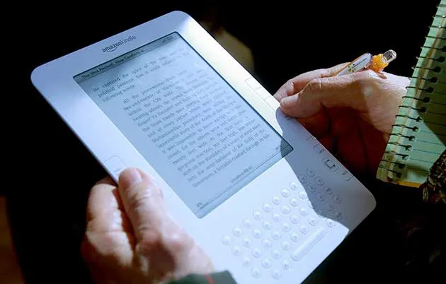 一名记者于2009年2月9日在纽约手持亚马逊Kindle 2.0摄影:Mario Tama/Getty Images