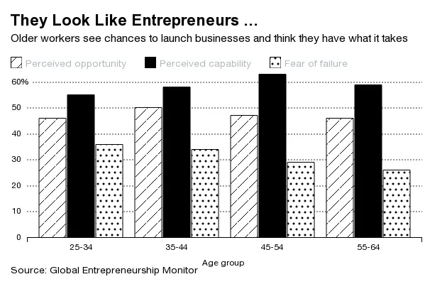 根据全球创业监测(GEM)对5700名美国工人的调查,55至64岁之间的美国人对自己成功经营企业的能力相对更有信心,并且对失败(及相关的财务损失)更不害怕。换句话说,完成GEM调查的晚期职业工人看起来比他们年轻的同行更适合创业。