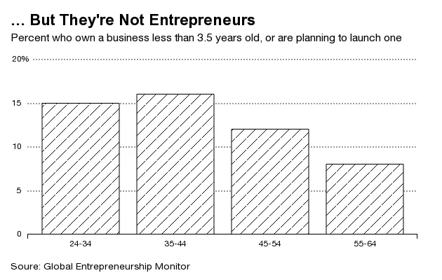 尽管具有这些特征,但根据GEM调查,该年龄段的工人比35至44岁之间的受访者更不可能经营一家早期公司。