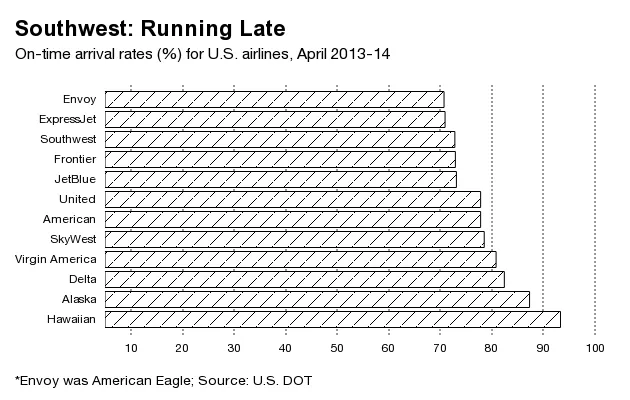 在过去的一年中,西南航空在美国交通部的每月航空公司准时表现统计中排名接近底部,在截至4月30日的12个月中,只有72.9%的航班按时到达。只有两家地区航空公司,Envoy(前美国鹰航空)和SkyWest的ExpressJet单位,在此期间表现更差。
