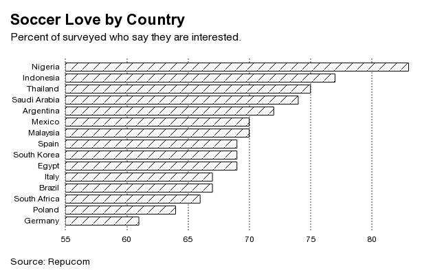 根据市场研究公司Repucom在2013年的一项调查,83%的尼日利亚人表示对足球感兴趣,65%的人参与这项运动。这两个结果使尼日利亚在33个被调查国家中名列前茅。相比之下,美国的兴趣为27%,参与率为10%。以下是按足球兴趣排名的前15个国家: