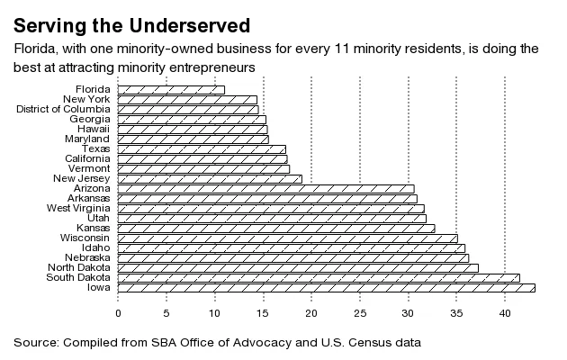 图森,亚利桑那州摄影:大卫·苏克西/盖蒂图片社在为少数族裔企业家提供机会方面,并不是所有州都是平等的。在佛罗里达州,每11名少数族裔居民就有一家少数族裔拥有的企业,这是全国少数族裔创业率最高的地方。爱荷华州的比例为每43名居民一家企业,是全国最低的。