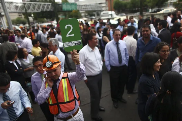 工人在2014年5月8日墨西哥城发生6.8级地震后撤离一座政府大楼。路透社/埃德加·加里多