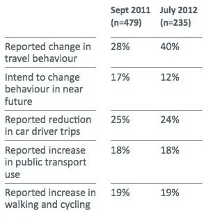 到目前为止,该项目非常有效。哈兰表示,去年SDG在近25,000个家庭中发现,9个城市的汽车驾驶出行减少了11%。(SDG通过样本人群的前后出行日记或自我报告调查来衡量结果。)在2011年5月开始的西米德兰兹项目中,SDG发现一年多后报告的汽车出行减少了24%。