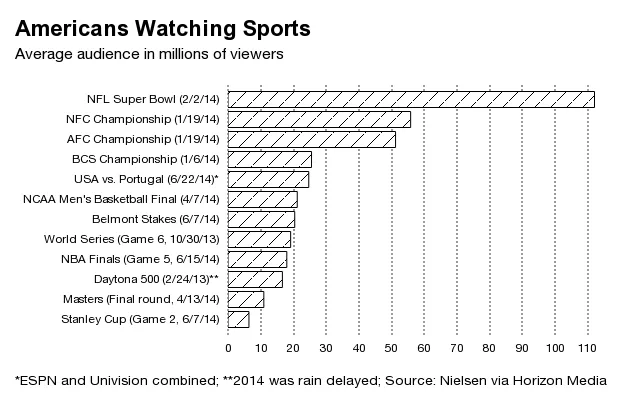 上面的图表显示了过去一年NFL、NBA、MLB、NHL、纳斯卡、大学足球、大学篮球、赛马和高尔夫的精选重要赛事。此外还有周一的世界杯比赛。每个事件的观众人数是通过Nielsen收集的数据测量的,数据由Horizon Media的布拉德·阿德盖特提供。由于今年的戴通纳500由于长时间的降雨延误而导致收视率下降,因此图表使用了2013年的观众人数。斯坦利杯、NBA总决赛和世界系列赛的七场最佳系列赛中的最高收视率比赛,以及大师赛的最高收视率日也被显示。