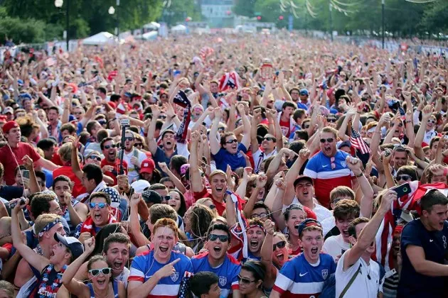 格兰特公园的球迷庆祝美国在6月22日于芝加哥举行的G组世界杯足球赛中对阵葡萄牙的进球摄影:斯科特·奥尔森/美联社2014年美国与葡萄牙的世界杯比赛为ESPN和Univision带来了另一个创纪录的收视率。合计2470万观众——1820万 在ESPN上和650万 在Univision上,这两个数字尚未正式确认——将使其成为美国历史上收视率最高的足球比赛,仅仅 超过2010年西班牙与荷兰的世界杯决赛。