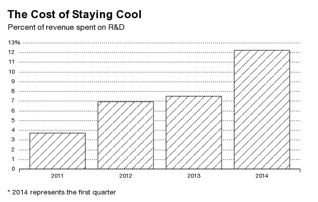 根据 其对华尔街的推介,该公司正在同时追求这两条路线。截至今天早上,它正在销售一系列新的支架(包括 “鹅颈支架” 和一个 与夜视镜配合使用的支架)。毫不奇怪,该公司的研发成本正在激增。在最新的季度中,GoPro收入的12%用于研发。相比之下,苹果在那段时间内仅将3%的销售额投入设计实验室。